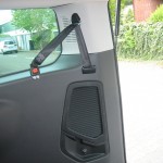 Die beiden Aluminium – Aufbaurasterschienen und der Schulterschräggurt garantieren einen sicheren Transport der Person auf dem Rollstuhl.