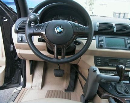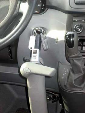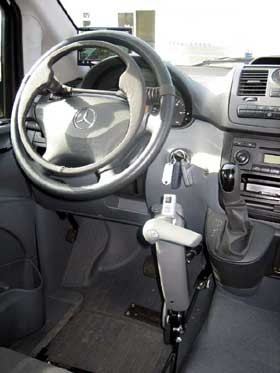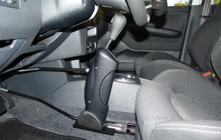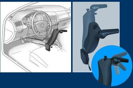BG linksDieses Gerät wird unterhalb der Lenksäule befestigt. Gas- und Bremspedal sind durch ein Zieh-Drück-Gestänge miteinander verbunden, das mit der linken Hand bedient wird. Bremsen erfolgt durch Druck nach vorn. Zum Gasgeben wird der Handgriff an das Lenkrad herangezogen. Für Fahrer ohne Mobilitätseinschränkung bleiben die Originalpedale komplett erhalten.